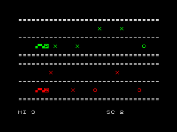 Control the red car and the green car at the same time. Take all the O. Avoid the X.